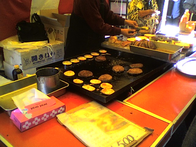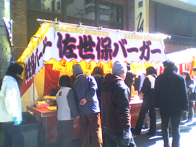 佐世保バーガー 湯村の厄除けに行きました。しかし、メインは露店です。露店がたくさん並んでいます。たこ焼きすぐに買いました。焼きたてやわらか、旨い。他にも露店が誘ってきます。ただ、買いすぎても食いきれないので、たこ焼きで口にフタをしながら歩きます。じゃがバタ、焼きそば、甘栗・・・買い過ぎないようになんとか堪えて通り抜けれました。しかし、負けた。鉄板でハンバーグを焼いている。ハンバーグの肉汁がたまりません。『佐世保バーガー』です。日本が誇る、メガサイズのハンバーガー。御当地グルメで有名な長崎県佐世保市の佐世保バーガーです。最近のハンバーガー等の巨大化でセールスしている会社が多いですがその元祖は佐世保バーガーです。山梨県で佐世保バーガーを食べれる機会はもうないんじゃないか・・・と思い買いました。500円でした。焼いてもらっている間におばちゃんと会話。俺「ホントに佐世保なの?」おばちゃん「向こうで勉強して・・・」おばちゃんは、会話と作業が同時にできない素朴さ。食べてみると異常なデカさ。バンズはやわらかで端っこがちょっとカリカリ。一口ではハンバーガーの中身にたどり着けないのに不快じゃない味。いよいよ肉。ハンバーグ。うまいです。他にコメントがありません。すごいボリューム。俺が食い始めたとたんそのお店に行列が・・・なんか、いい事した気分になれて更に充実。いつか本場に食べに行きたくなりました。 2008年2月16日(Sat)|食べ物|たわし