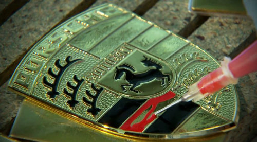 自動車メーカーのエンブレムやシンボルを立体化して、ボンネットやフロントグリルに装着したものをフードクレストマークと呼ぶそうですが、ポルシェの場合は手作業が占める割合も大きいようです