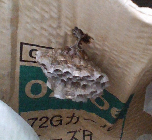 覗き込むと、そこには、7〜8匹ほど蜂がおり、そこには5・6cm位の蜂の巣が・・・