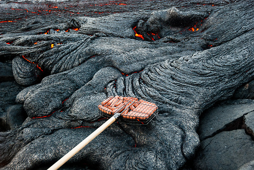 ハワイのキラウエア火山では、溶岩の熱を利用して葉っぱなどに包んで焼く