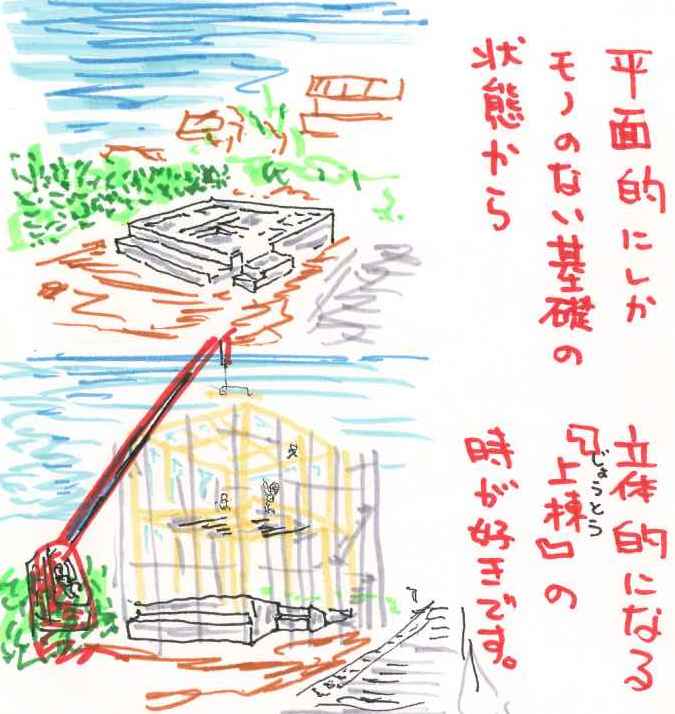 上棟は、平面的な状態から、立体的になるので楽しいです。